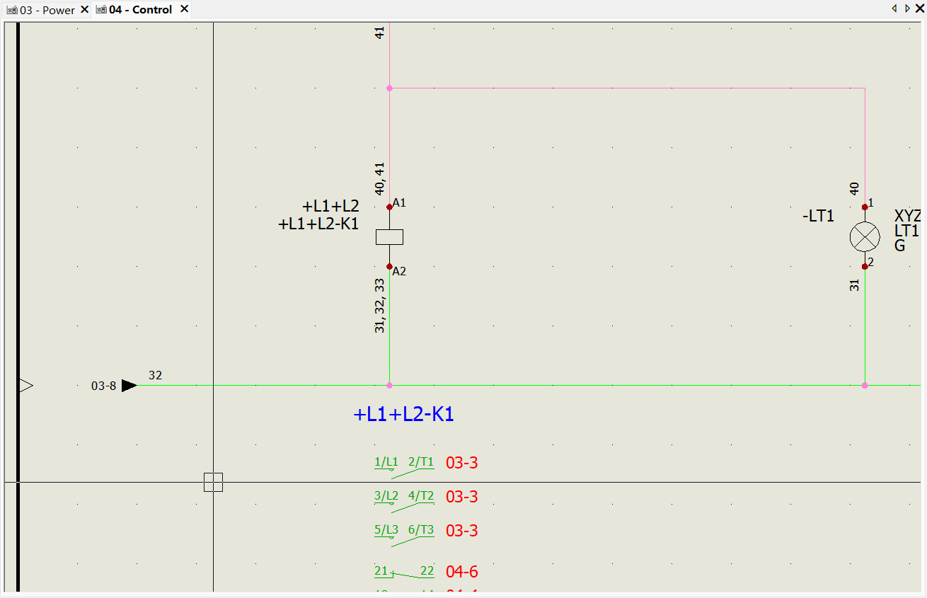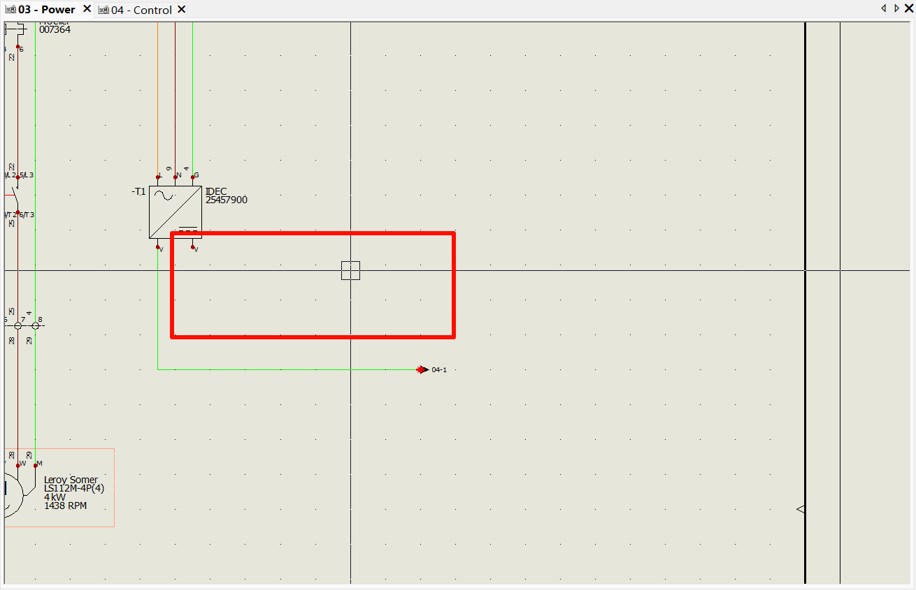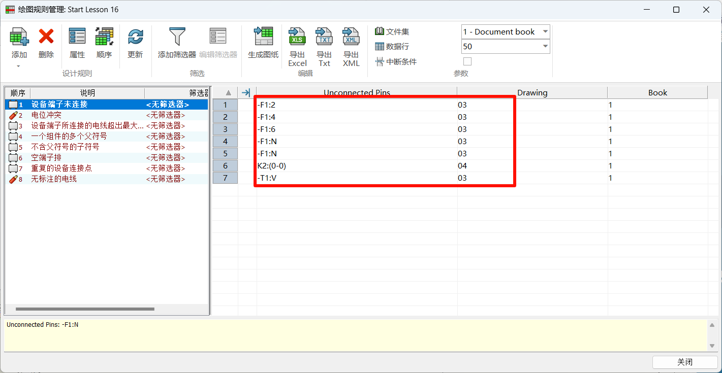 在此项目工程中我们可以看到设备段子为连接点的错误,有两个错误分一个是03页面的-F1和-T1,另一个错误显示在页面04的K2。