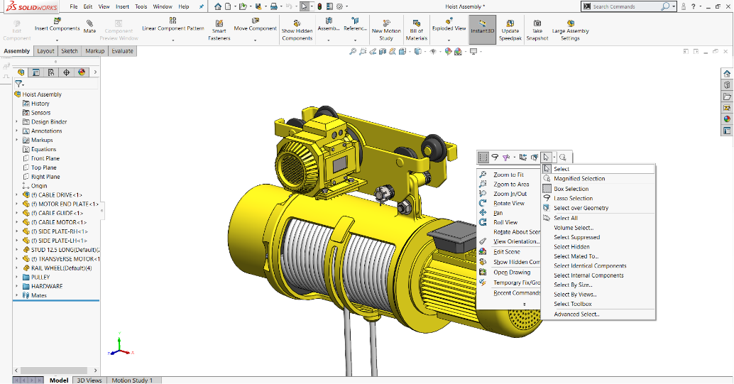 让我们看一下 SOLIDWORKS 中的选择工具,它提供了与组件选择进行交互的最简单方法