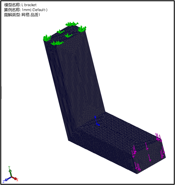 问题描述:L型支架上端面固定,同时在下端面施加900N弯曲载荷,分别使用10mm、3mm、1mm的网格求解模型,对比应力结果。