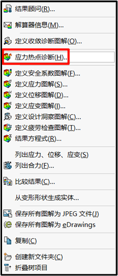 在SOLIDWORKS Simulation中,我们可以通过【应力热点诊断】去检测应力峰值点,一旦检测到应力峰值点,就可以通过应力奇异算法在感兴趣的位置进一步细化网格。