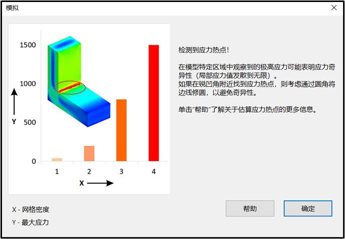 从图中我们观察可知,应力的变化并没有趋于平稳。根据应力公式:Σ=F/A,物体受力面积A越小,物体受到的应力Σ越大。而在本例中L型支架的连接处为一条直线的尖角,其面积为无穷小。根据弹性理论,在尖角处的应力是无穷大的。由于离散化误差,有限元模型并不会产生无穷大的应力结果,这一离散化误差掩盖了建模时的错误。